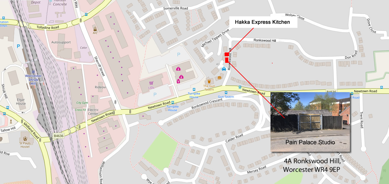 The address is 4A Ronkwood Hill WR4 9ER (the post code is a little off so please see map below) to the right of the studio is a Indian takeaway